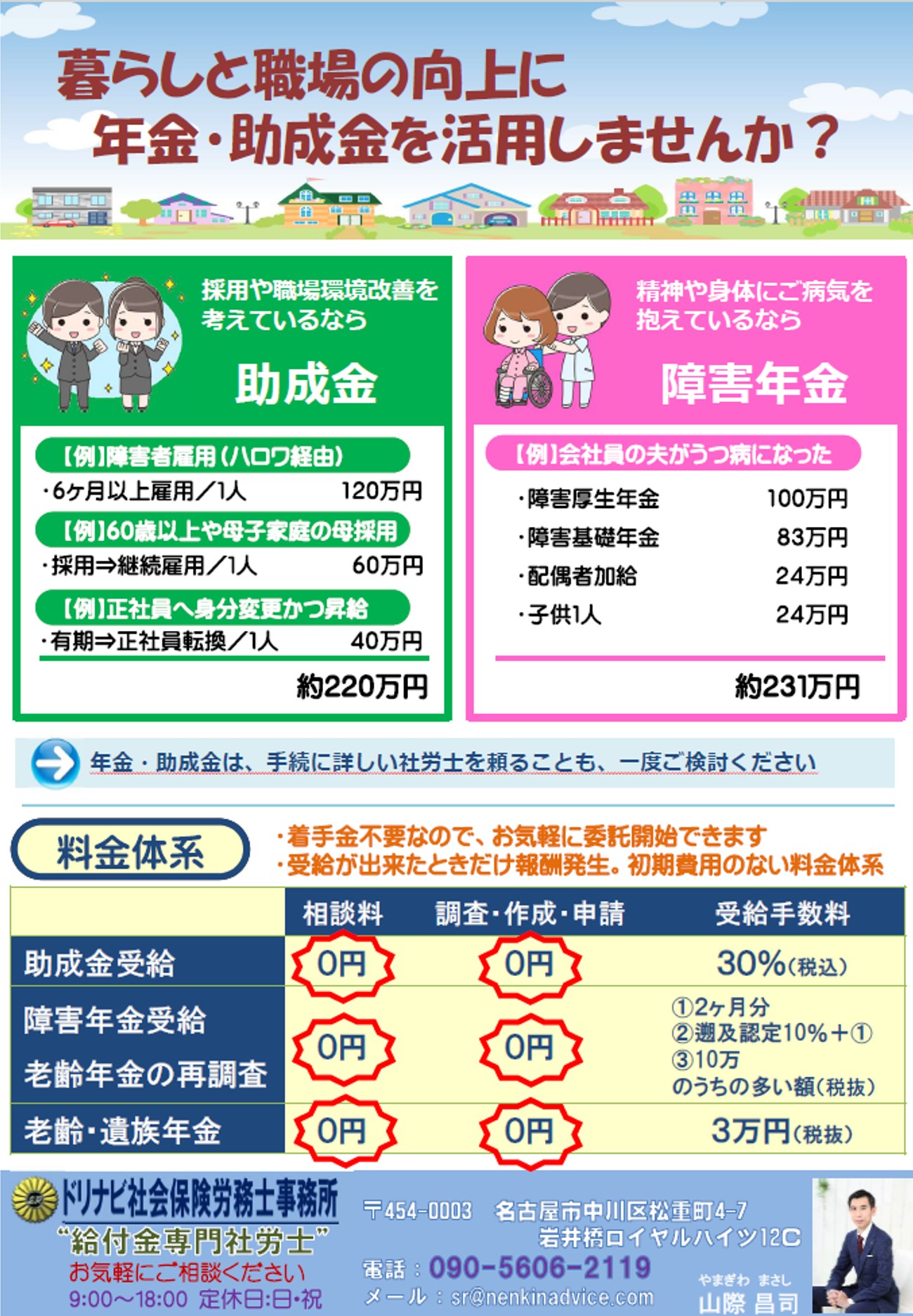 ★障害年金 相談・着手金 0円 調査・作成・申請 0円 (診断書を社労士が立替えた場合等は実費) 受給手数料 ①【原則】年金2ヶ月分 ②【例外(遡及認定受給)】遡及額10%+① ③【例外(3級最低保障など)】10万円 上記①~③のいずれか多い額(税別) ★助成金 相談・着手金 0円 調査・作成・申請 受給のために必要な労務帳簿整備(必要な会社で初回のみ) ※従業員規模により11万円~ ※雇用契約書や就業規則、36協定や出勤簿など不備があるとき 受給手数料 受給額の30%(税込)