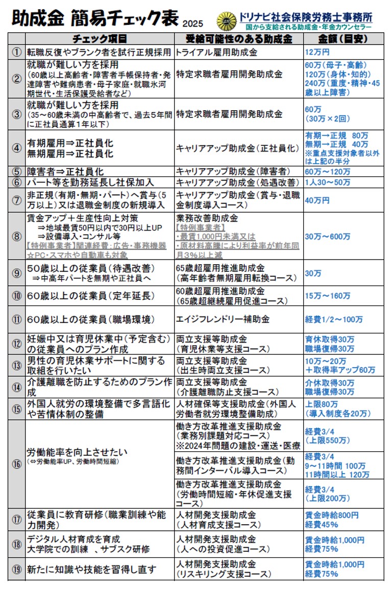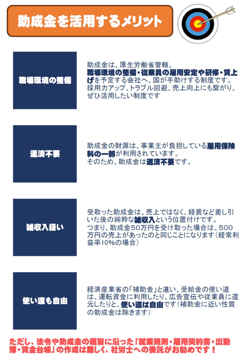 - ネットや本を読んだだけでは分かりにくい、労務管理や帳簿作成のコツをお伝えいたします。労務管理や帳簿作成にはコストがかかるものですが、上記の助成金受給によって、コスト削減しつつ職場環境整備が可能です